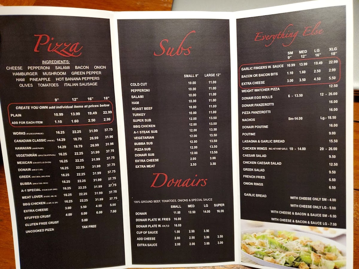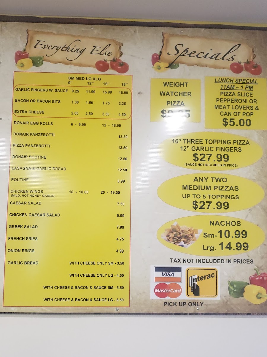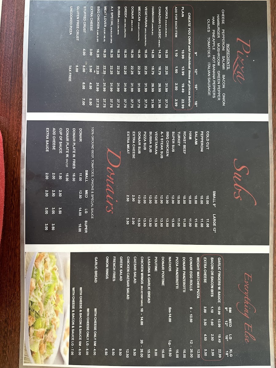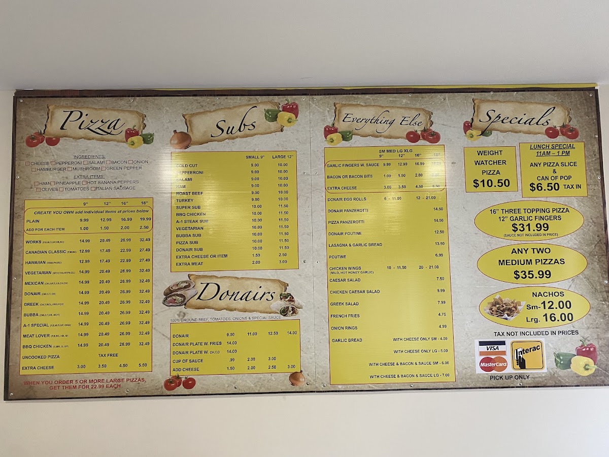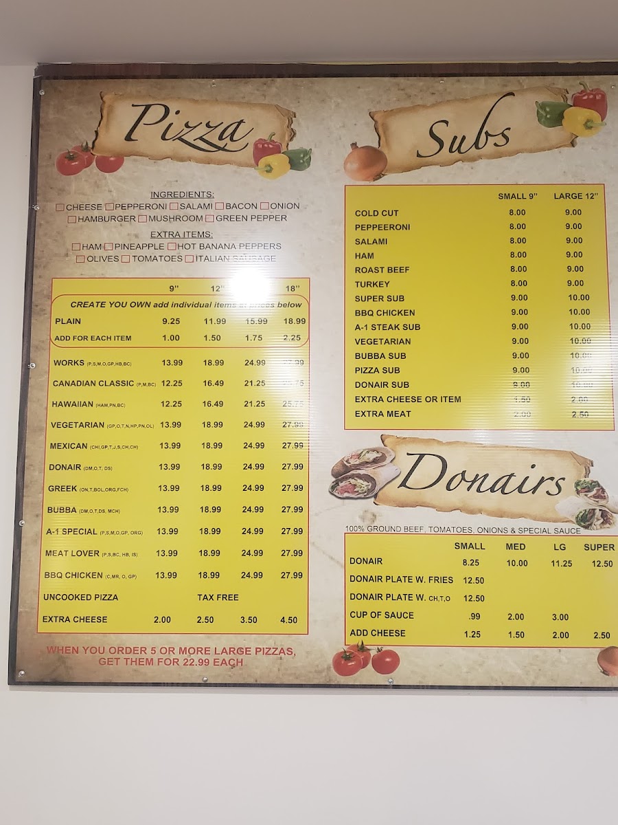 The menu features a range of classic and hearty choices, from crispy garlic fingers served with sauce to generously topped subs like the A1 Steak or the Donair Sub. Pizza lovers can enjoy a variety of traditional options—such as the Meat Lover, Greek, or the local favorite Donair pizza—or build their own with a selection of toppings. For those seeking something beyond slices, offerings include lasagna with garlic bread, poutine, and fresh salads to complement the meal.